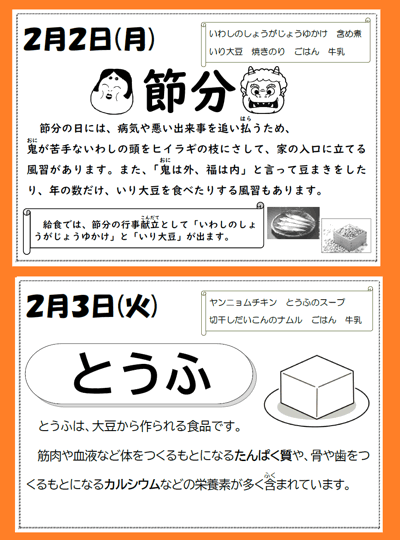 行事献立として、節分の献立があります。果物も、いよかん、デコポン、いちご、洋なし(カット缶)が提供されます。しっかりいただきましょう。