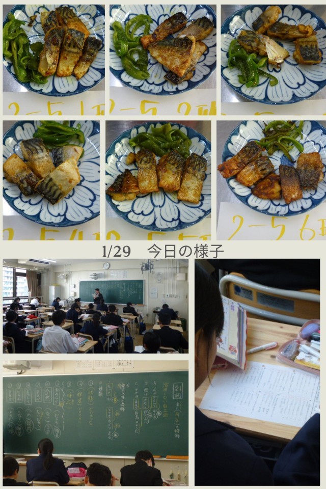 今日も2年生がさばのカレー焼き、そしてピーマンのオリーブオイル炒めに挑戦中です。どのクラスも同じメニューのはずですが、盛り付け方は千差万別。自分たちで工夫しながら今日も楽しくおいしく実習を行っています。