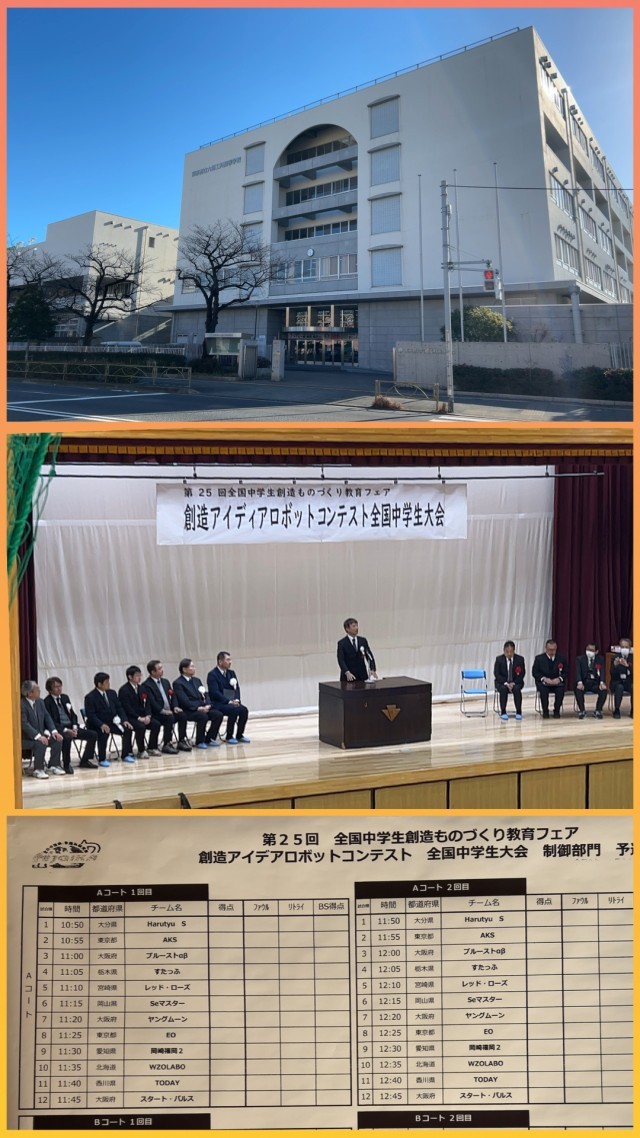 開会式では、全国各地区の代表生徒に対して、主催者とご来賓の方々から挨拶・激励の言葉がありました。ものづくりの大切さや、2040年の社会を見据えての人材育成の方策の一つとして、情報・技術科の創設の検討など、世界の潮流、日本の教育の方向性などを交えた生徒たちへの激励でした。各コートでの諸注意、ロボットの車検のあと、競技が始まります。