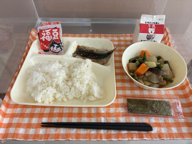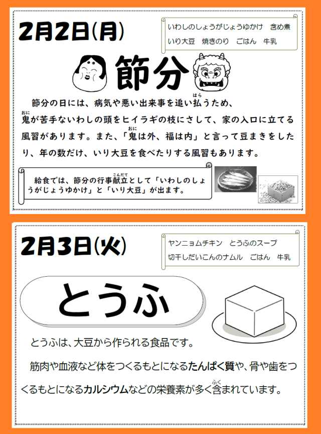 本日の給食では、節分の行事献立『いわしのしょうがじょうゆかけ・含め煮・いり大豆・焼きのり・ごはん・牛乳』が提供されます。しっかりいただきましょう。明日は『ヤンニョムチキン・とうふのスープ・切干しだいこんのナムル・ごはん・牛乳』が提供されます。お楽しみに。