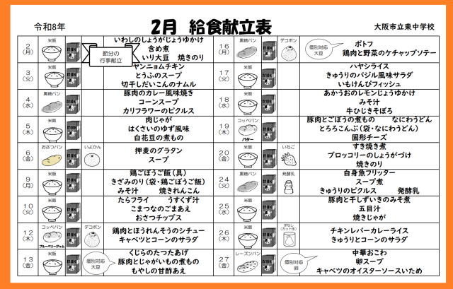 本日の給食です。【2月2日(月)】~2月の献立表を再掲します。