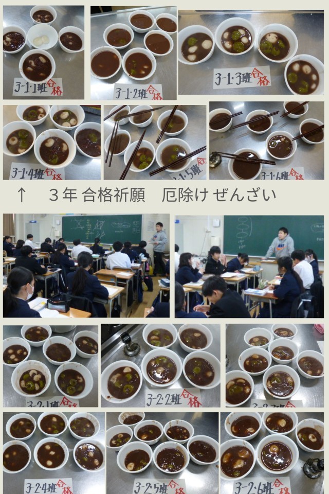3年生では最後の調理実習が始まりました。文字通り合格祈願の願いが込められた「厄除けぜんざい」です。給食を食べた後の時間においしいデザートとして作っていました。糖分をしっかり摂ると、勉強のための栄養が脳に届きます。この後も入試に向けて頑張ってください!