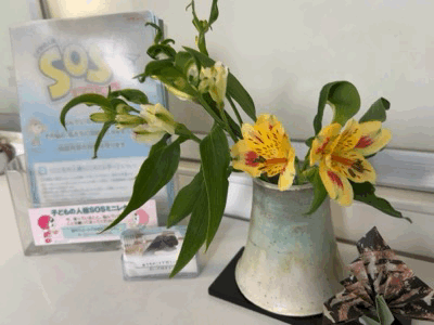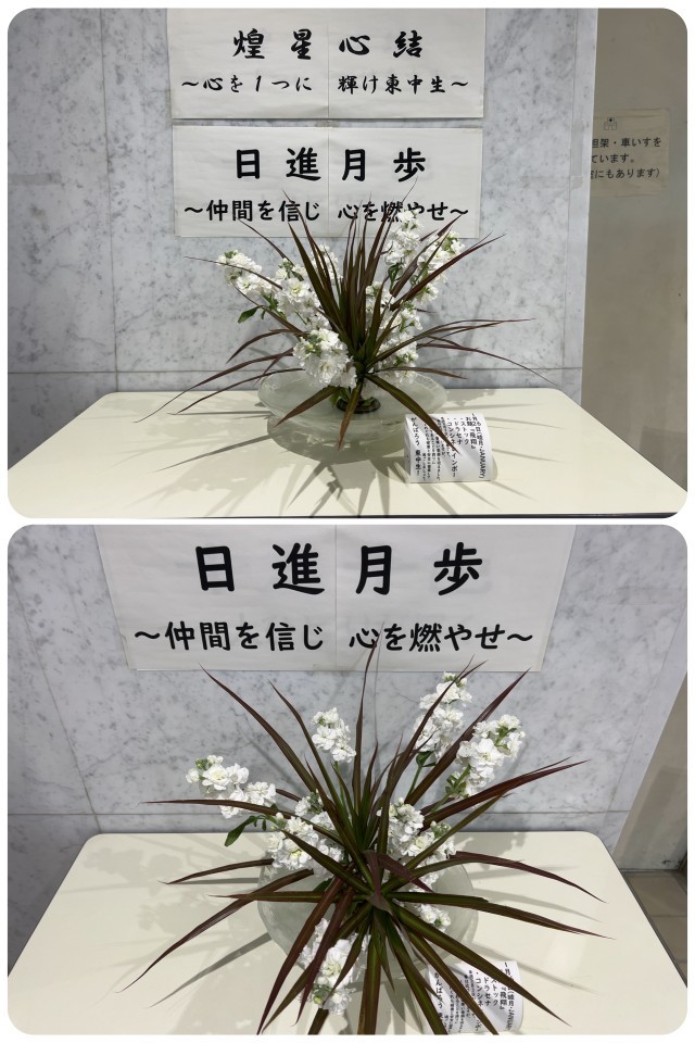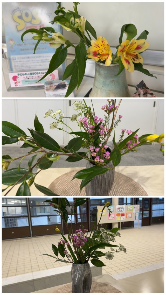 玄関ホールには『椿(わびすけ)・フリージア・ワックスフラワー』、職員室前には『アルストロメリア』を活けていただきました。いつもありがとうございます。一方で、玄関のお花は、こまめに手入れされているので長持ちしています。