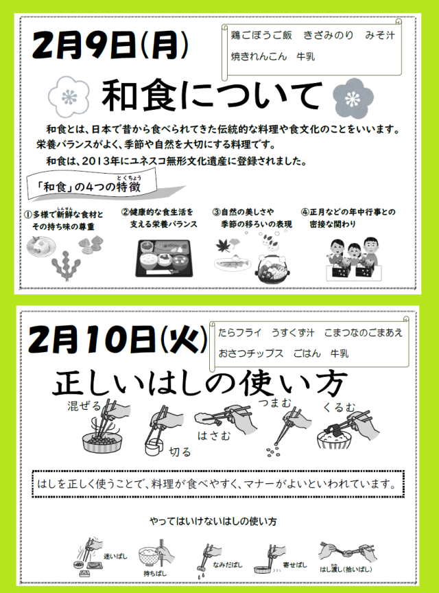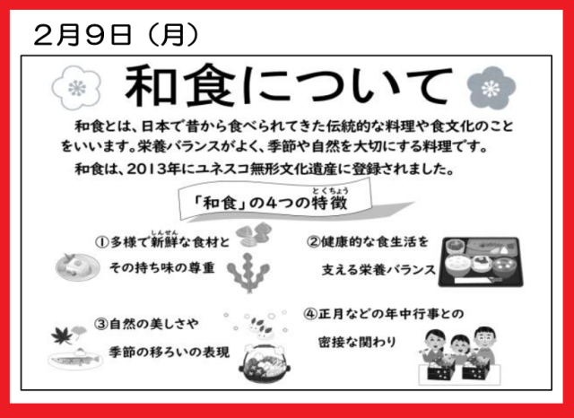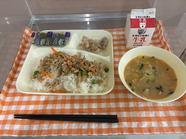 本日の給食では、『鶏ごぼうご飯(具)・きざみのり(袋・鶏ごぼうご飯)・みそ汁・焼きれんこん・牛乳』が提供されます。しっかりいただきましょう。
