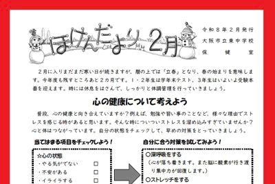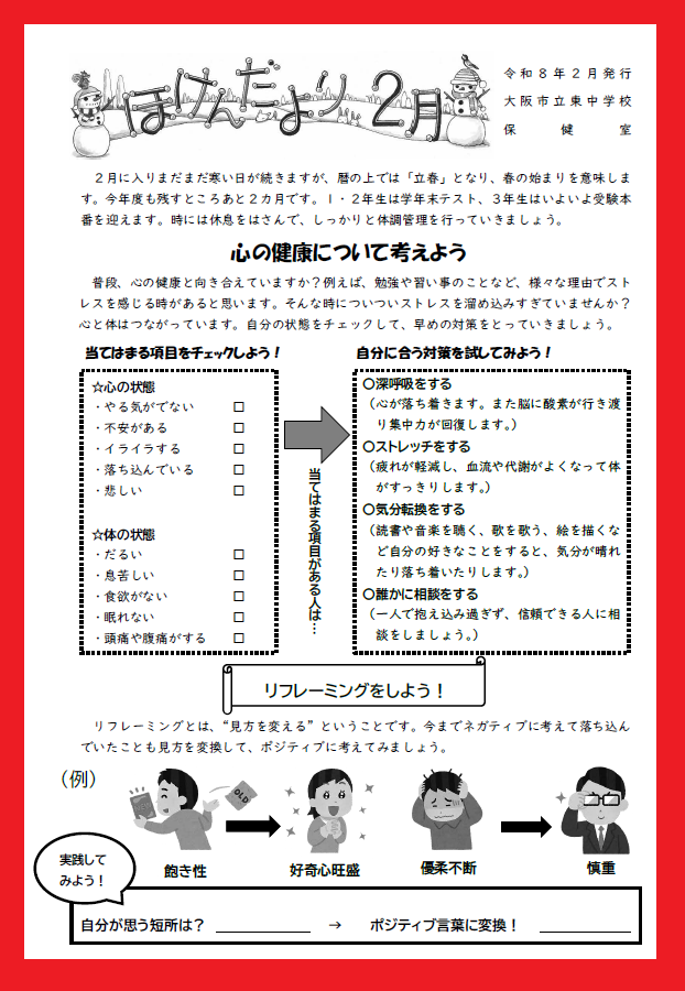 今月のほけんだよりでは、『こころの健康について考えよう』という見出しでチェックシートと対策リストが掲載されています。また、『リフレーミング』についての記事があります。ネガティブな見方もポジティブに考えてみましょう。
