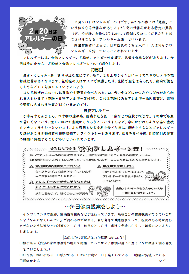 裏面では『2月20日はアレルギーの日』、『きみにもできる食物アレルギー対策!』、『毎日健康観察をしましょう!』の見出しの記事です。ぜひ、ご一読ください。