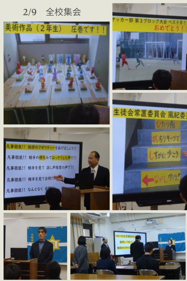 校長先生からのお話では、先週の1年生の職業講話と関連して、オリンピックで活躍する選手とその人たちを支える裏方の仕事に携わる人たちのお話がありました。また、地域の方による2月の生け花の紹介や、新校舎に飾られている2年生の美術作品の紹介やサッカー部の活躍、風紀委員会による廊下の「左側通行」のポスター紹介などがありました。