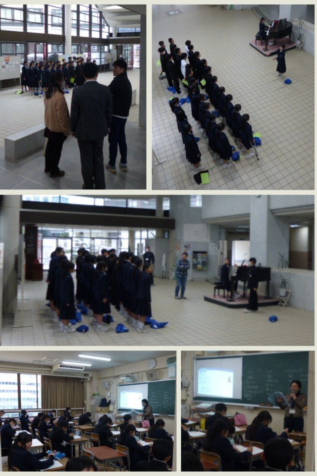 続いて1年生の合唱の練習ものぞかせてもらいました。来月に迫った1年生の合唱コンクールに向け、本格的に練習がスタートしています。今日は玄関ホールで二つのクラスが前後半に分かれて歌っています。どちらのクラスも、明日コンクールがあってもいいくらいの声量とハーモニーで、職員室にいてもきれいな歌声がよく聞こえました。ホールの片隅には通りがかった先生方が足を止めて聞き入る姿も。中には「鳥肌ものです」と驚く先生も。素晴らしい出来栄えに、早くも先生たちは1年生の合唱コンクールの成功を予感しています。ぜひ頑張ってください!