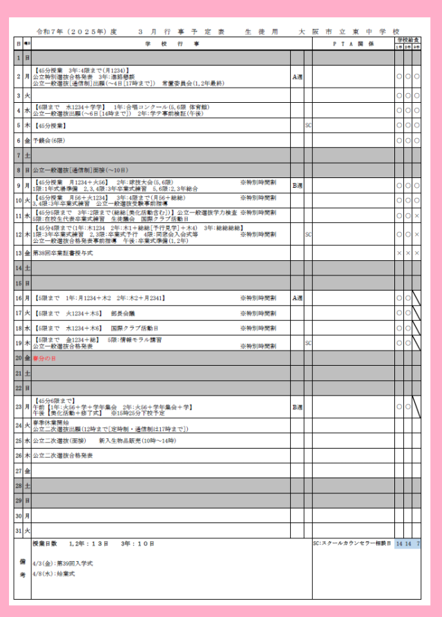 3月の行事予定表を掲載します。1年の締めくくりです。新しい学年、フィールドで良きスタートを切るためにも、締め括りは大切です。くれぐれも安全と健康に留意して過ごしましょう。