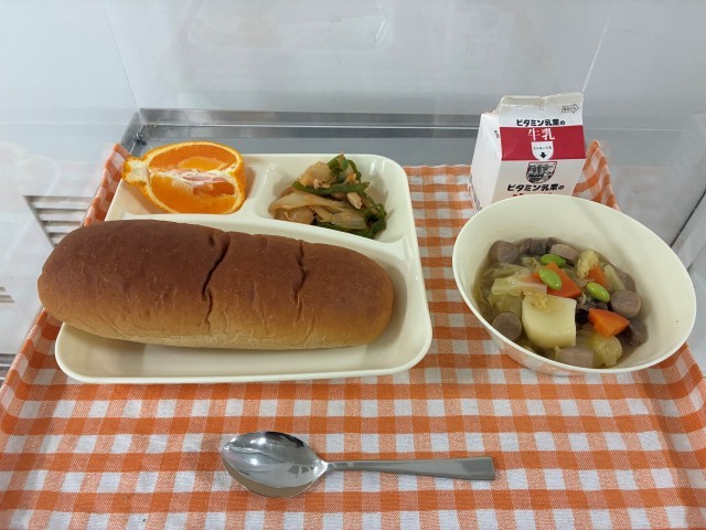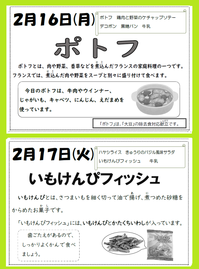 本日の給食では、『ポトフ・鶏肉と野菜のケチャップソテー・デコポン・黒糖パン・牛乳』が提供されます。しっかりいただきましょう。なお、本日は、大豆の個別対応食が用意されています。該当の生徒の皆さんは、カードをもって給食室まで受け取りに行きましょう。
