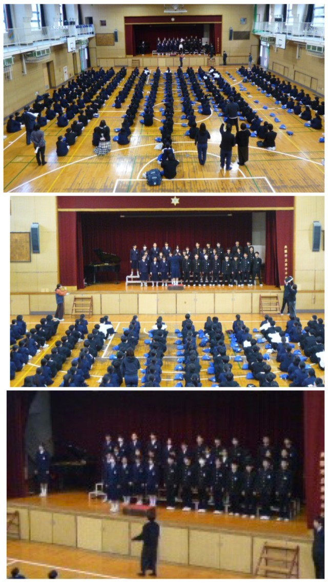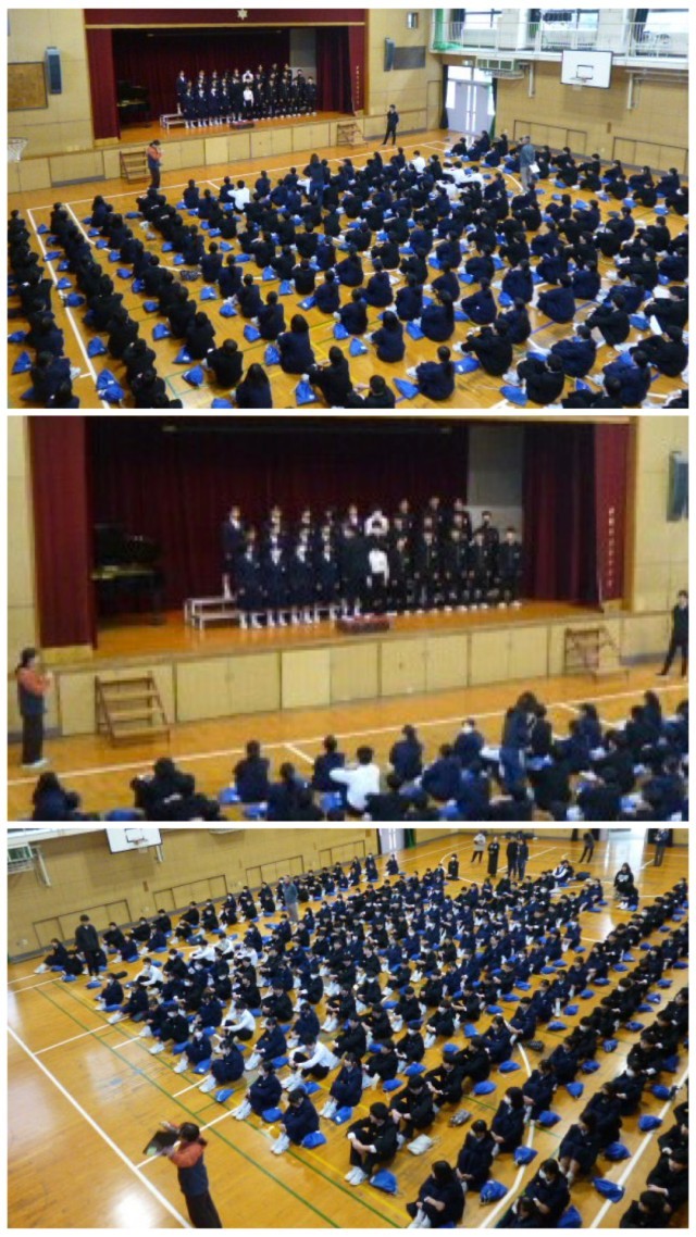 1年生が学年集会を行い、合唱コンクールにむけて、ステージへの入退場と動きの確認をしました。合唱コンクールは、歌の仕上がりとともに、鑑賞マナー、入退場も含めての行事です。