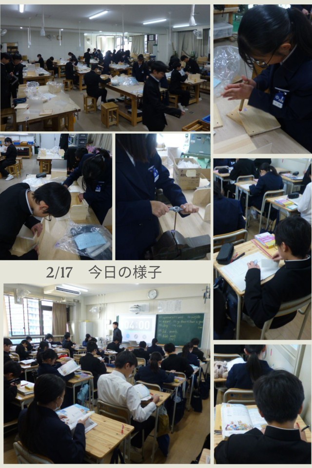 1年生の技術科の授業では、今日もマルチラックの作成が進んでいます。キリを使ってくぎを打つ穴をあける作業や、前カバーの支柱となる金属棒の端を丸く削る作業、仕上げのためにやすり掛けをする作業など、子どもたちは様々な工程に一生懸命取り組んでいました。