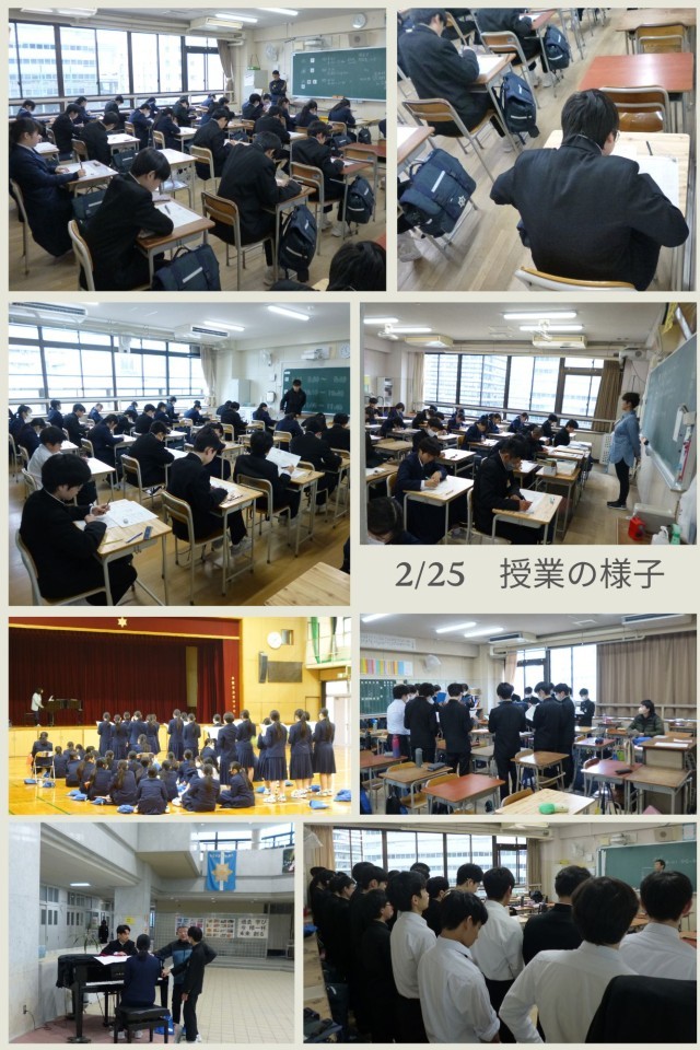 3年生は通常授業を行っています。5時間目は学年の取組で卒業の歌の合唱練習を行いました。12年生のいない校舎ですので、あちらこちら、たくさんの特別教室を使いながら練習を始めていました。卒業式で歌う最後の合唱曲はなかなか難しい曲の様子。困難はありながらも、38期生持ち前の一生懸命さで、当日は美しいハーモニーを披露してくれることと思います。頑張ってください。