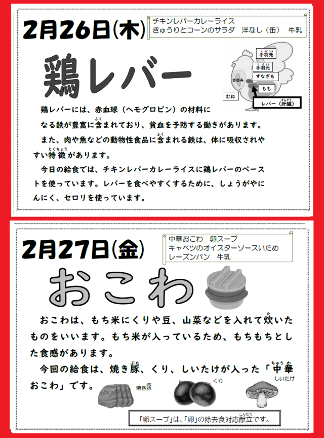 なお、卵スープには、個別対応食が提供されます。対象の生徒の皆さんは、カードをもって給食室まで受け取りに行ってください。