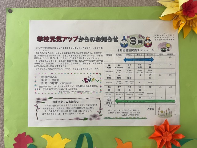 少しずつ春の気配が感じられる季節となりました。みなさん、いかがお過ごしでしょうか。3年生のみなさんは、いよいよ卒業の日が近づいてきましたね。中学校で過ごす時間もあとわずかです。卒業しても元気アップのメンバーはいつも図書室にいてます。近くに来たときは、ぜひ元気な顔を見せてくださいね。