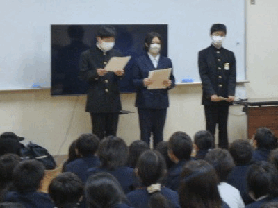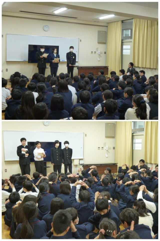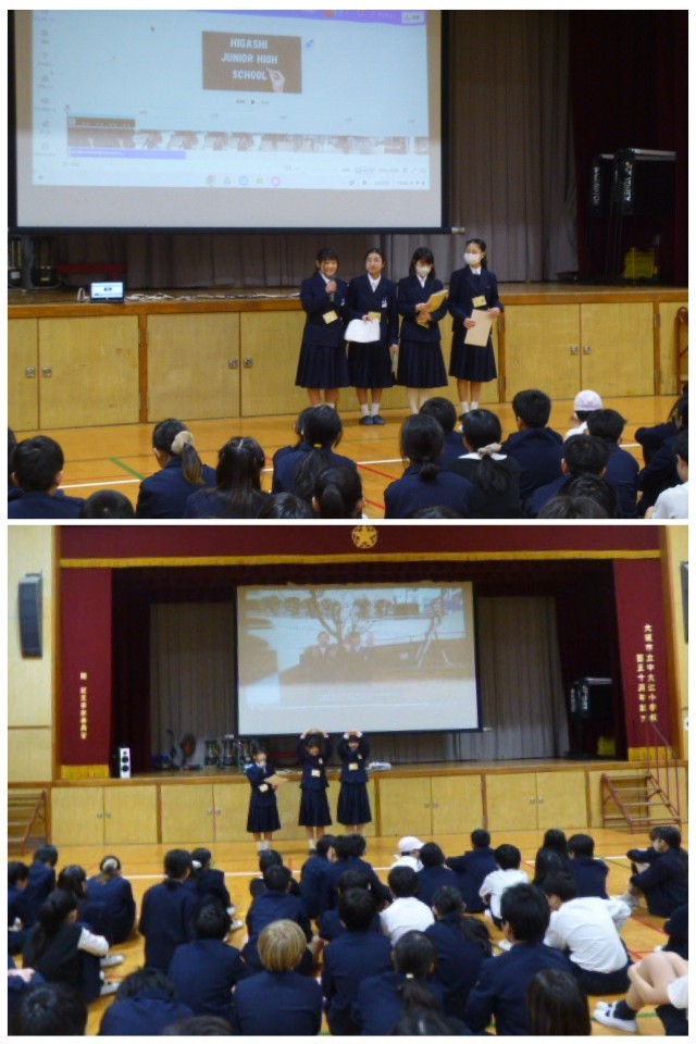 生徒会役員とESS部の皆さんが、校区の2つの小学校を訪問して、東中学校の紹介をしました。小学生は先輩の訪問に興味津々。学校紹介のビデオを鑑賞後の質問タイムでは、なかなか鋭い質問もありましたが、生徒会役員が落ち着いて答えていました。