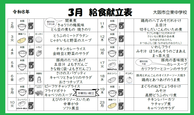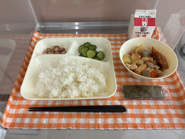 本日の給食では、『関東煮きゅうりの梅風味・とら豆の煮もの・焼きのり・ごはん・牛乳』が提供されます。しっかりいただきましょう。