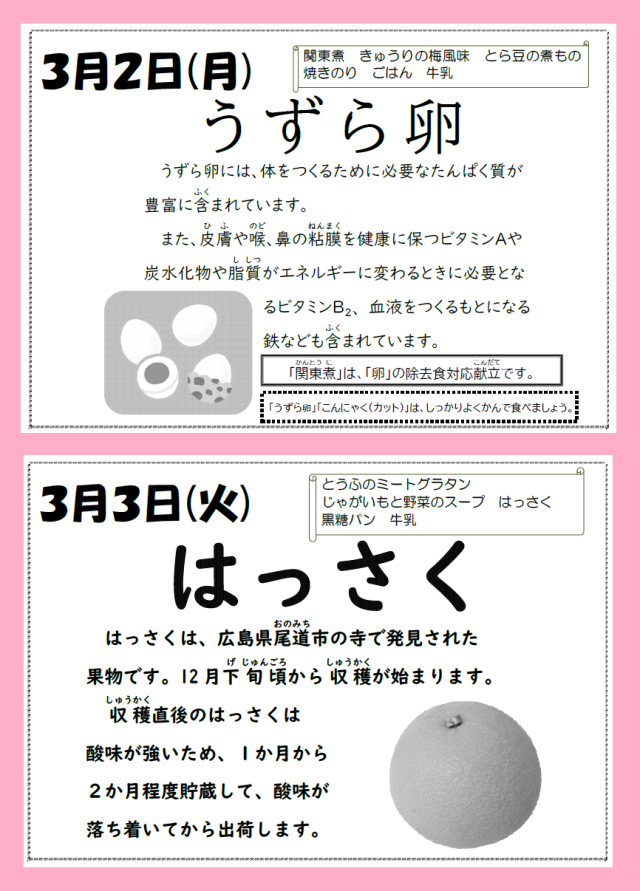なお、関東煮にはうずら卵がありますので、個別対応食が提供されます。対象の生徒の皆さんは、カードをもって給食室まで受け取りに行ってください。