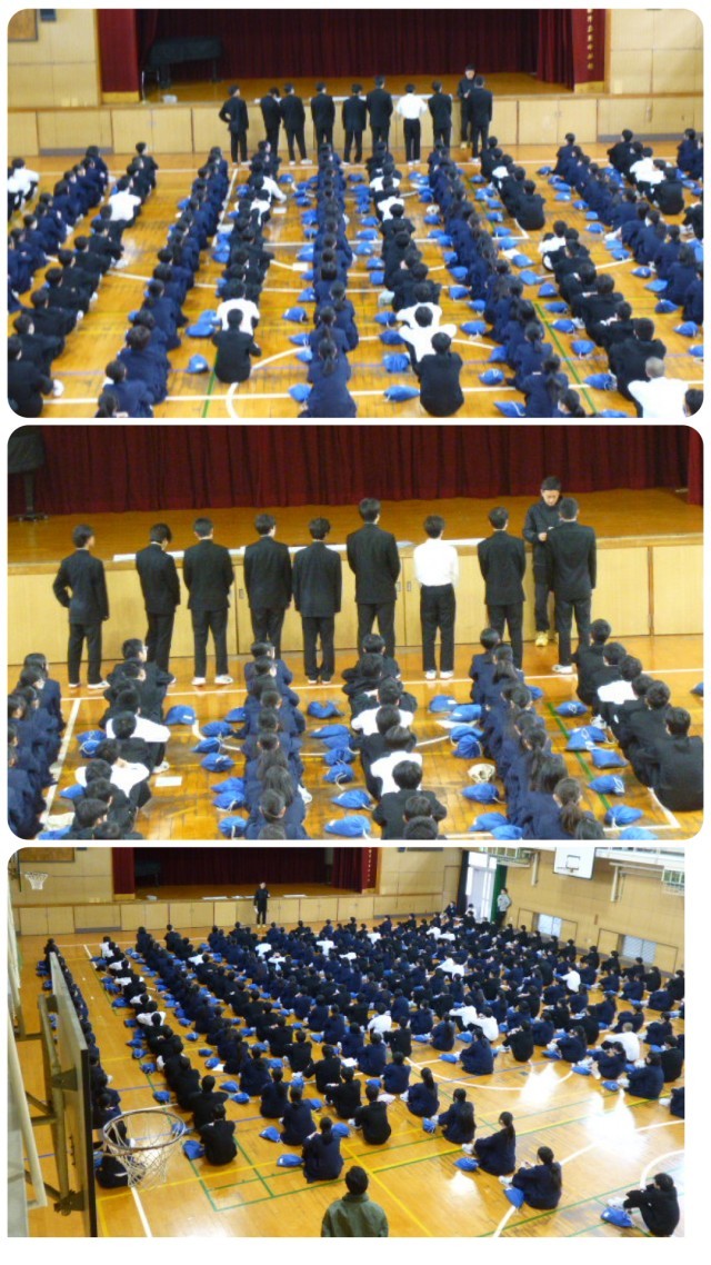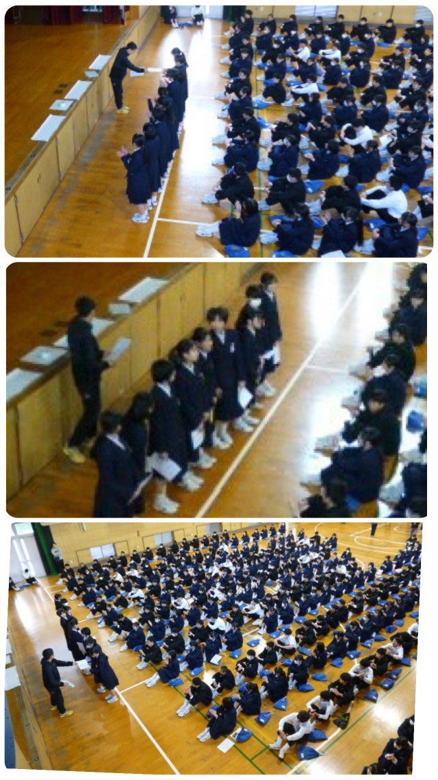 2年生の朝の学年集会で、大阪城マラソンの表彰式を行いました。入賞した皆さん、おめでとうございました。また、入賞こそできなったけど記録を更新した皆さんも、おめでとうございました。