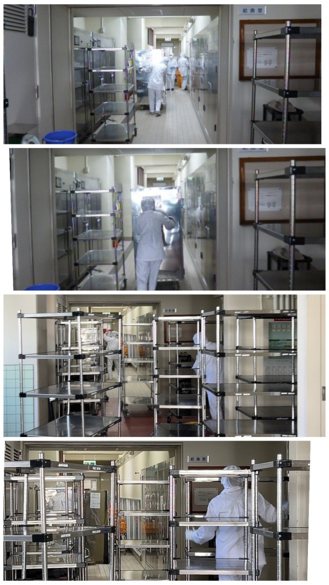 給食室の午後の様子です。配膳が終わったワゴンが次々と戻ってきます。それは本校生徒の分だけでなく、上町中学校の分もです。限られたスペースで、実に手際良く作業が進みます。毎日ありがとうございます。そして、同時にご飯を入れていた青の入れ物の回収の方が来られました。この時間は、今日の片付けとともに、明日の配膳の準備です。明日の給食が、楽しみです。明日もよろしくお願いします。
