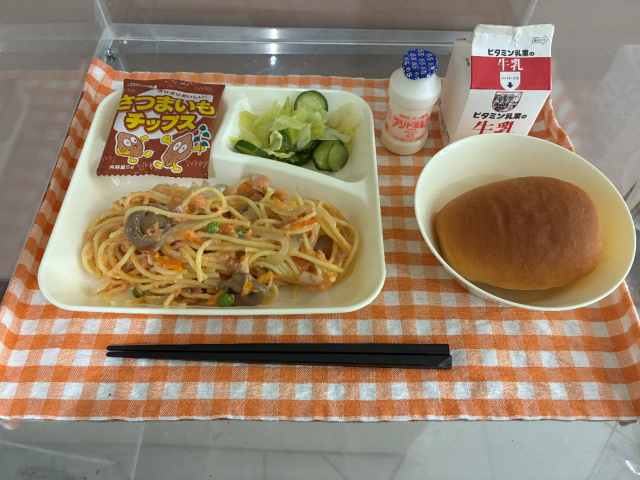 今日の給食では、「さけのスパゲッティ・キャベツときゅうりのサラダ・おさつチップス・ミニコッペパン・発酵乳・牛乳」が提供されます。しっかりいただきましょう。