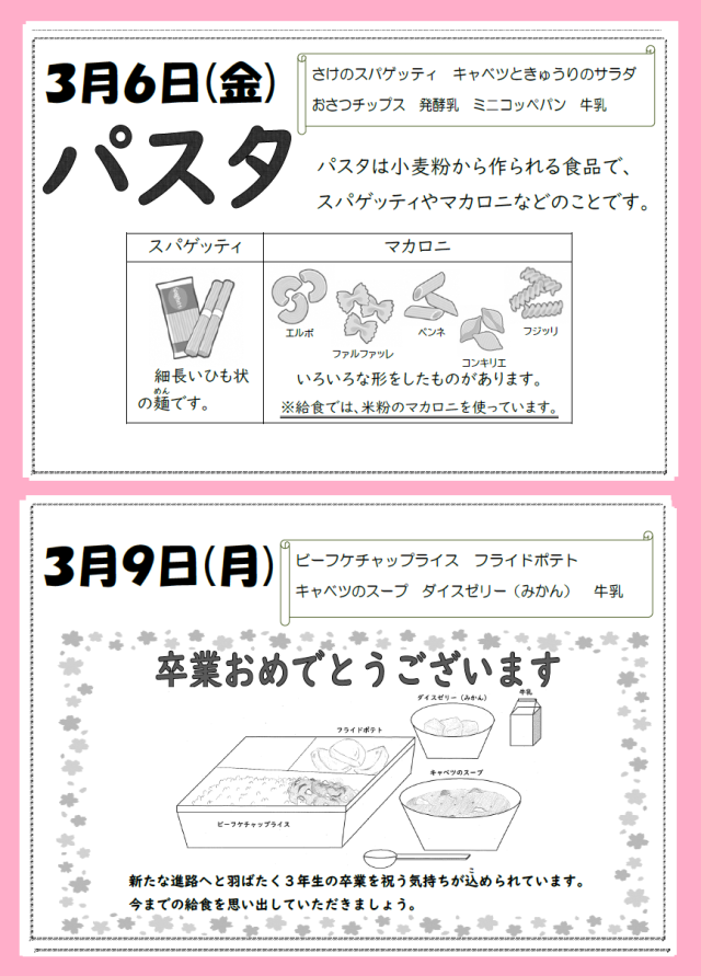 来週の月曜日は、卒業お祝い献立として「 ビーフケチャップライス・フライドポテト・キャベツのスープ・ダイスゼリー(みかん)・牛乳」が提供されます。お楽しみに。