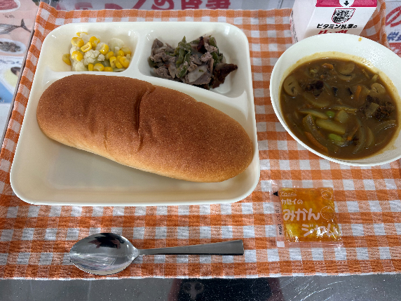 今日の給食では、「豚肉の香味焼き・カレースープ・カリフラワーとコーンのサラダ・コッペパン・みかんジャム・牛乳」が提供されます。しっかりいただきましょう。なお、『カレースープ』は「大豆」の除去食対応献立です。該当する生徒の皆さんは、カードを持って、給食室まで受け取りに行きましょう。