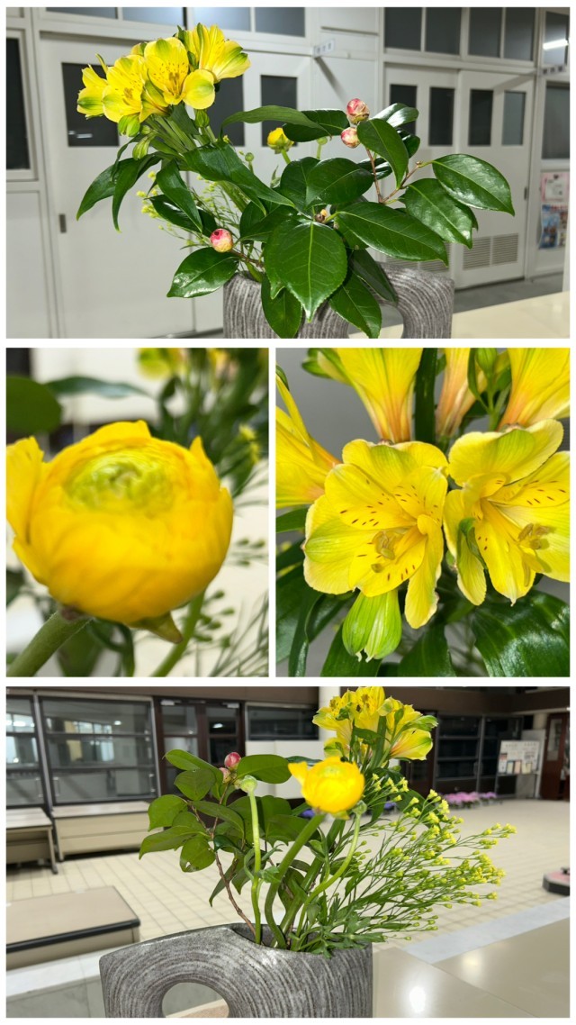 また、今週3月31日(火)の離任式、4月1日(水)の新校長先生着任式、4月3日(金)の入学式に合わせて、玄関ホールには、『つばき・アルストロメリア・ラナンキュラス・ソリダスター』が、職員室前には『ガーベラ・ソリダスター』を生けていただきました。最後までありがとうございました。また、新年度もよろしくお願いいたします。なお、各セレモニーの主な予定時刻は次の通りです。