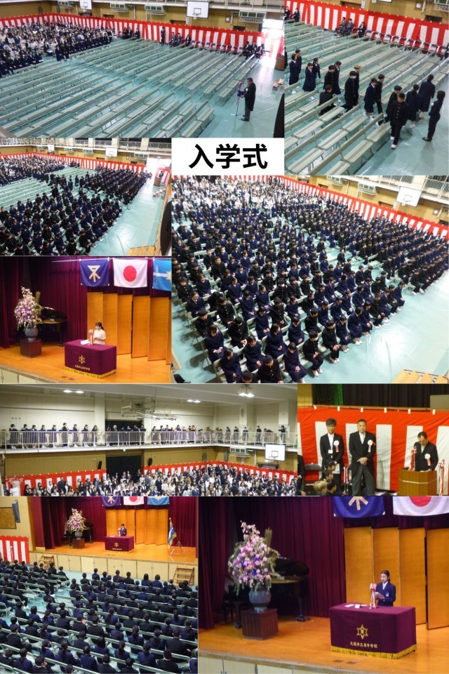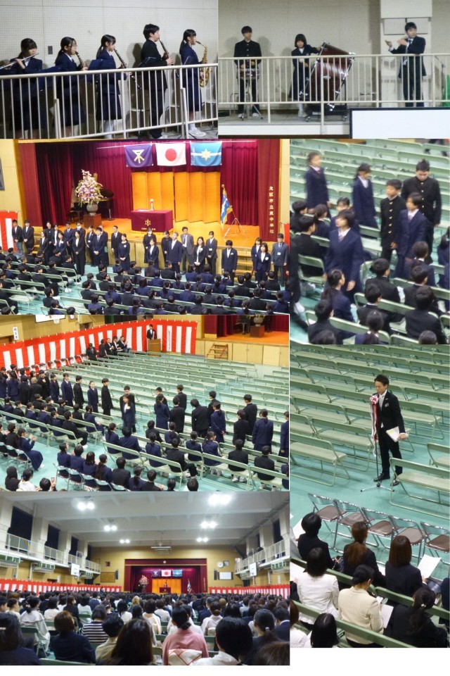 吹奏楽部の子どもたちが朝早くから準備をし、演奏により式を彩ってくれます。入場の曲から、国歌、大阪市歌と体育館のギャラリーから素敵な演奏が響きます。歌い終えた子どもたちは、男女に上がる校長先生や在校生、新入生の代表生徒、またご挨拶くたさったPTA会長さんの姿を食い入るように見入って話を聞いています。真剣に話を聞くまなざしに、これからの学校生活に対する希望と期待が感じられました。
