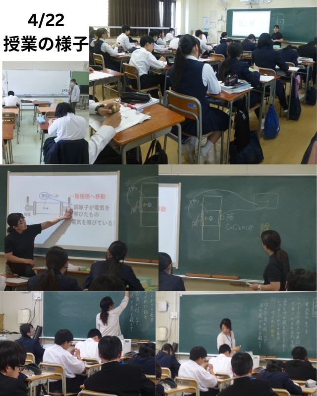 3年生の理科の授業では、塩化銅水溶液の電気分解について説明がありました。「塩化銅水溶液の水滴を紙にしみこませて電流を流したら、水滴のシミはどちらに動くか」という問いに、子どもたちは頭を悩ませます。塩素と銅とが、プラスとマイナスの電極のどちらにくっついていくかというところから説明が始まるとだんだんと子どもたちの表情も明るく「わかった」が増えていくのが分かります。化学は目に見えない世界の学問ですが、わかると楽しい。子どもたちにもぜひ頑張ってほしいと思います。