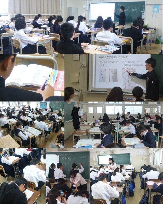 1年生の英語では、辞書の引き方について説明をしていました。単語の一文字目を意識して開くこと、開いたページの一番上にはそのページにのっている単語のつづりの範囲が書かれていること、また単語は2文字目を意識して開くと目的の単語にたどり着く近道になること、などたくさんの「コツ」を聞いています。辞書との付き合いはこれから長くなりますから、今日のように、よりよく引く手順、方法を聞いておくと便利ですね。
