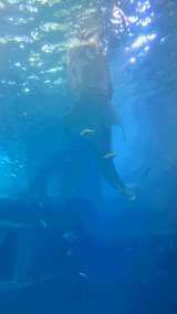 ジンベイザメの餌やりの見学。大量の水と共に餌を吸い込んで食べます。 また、魚のヒ...