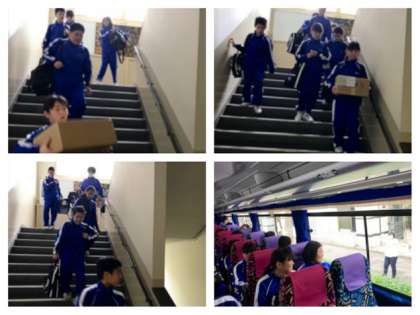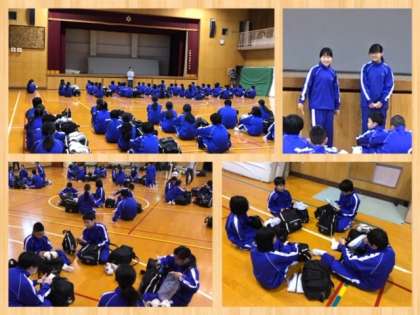 朝の出発式で、班長代表の「一泊移住を成功させるぞ!」のかけ声に、みんなで「オー!」とこたえました。班ごとに荷物確認をし、元気に出発することができました。