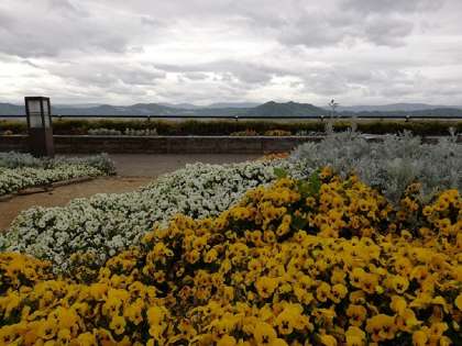 バスの旅も順調に進んでいます。写真は、紀ノ川SAから見渡せる景色です。天候はもう少しもってくれるかな?手前のお花はパンジーですね。