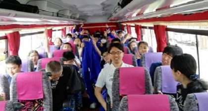 写真は2号車のようすです。 みんな元気いっぱい。バスの旅を満喫しています。