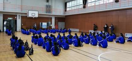 写真は、体育館で諸注意をうけているところです。おはなしをよく聞いて、きまりをまもってすばらしい活動を!