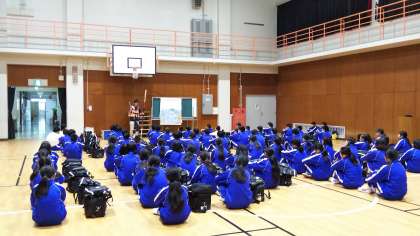 明日に変更になった海の活動、カヌー・カヤックで使用する道具の説明をスタッフの方がしてくださっています。みんな真剣に聞いています。明日、楽しみですね。