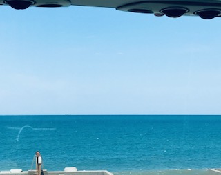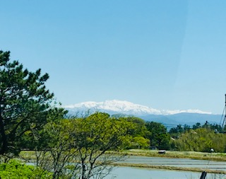 尼御前SAで休憩しました。遠くには、雪が残る白山が見えます。車内から日本海が見えます。