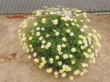 鉢植えのマーガレットは、花が終わって植え替えられる運命ですが、地植えのものは一株でこのように見事です。