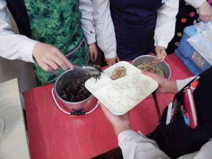 ・・・ごまだれ焼き。ごまだれ焼きですよ皆さん。なんと美味なひびきの言葉ではありませんか。しかしてそのお味とは!?おかわりの手が上がる本数が物語っておるではありませんか?くわしくは帰宅後に存分に語ってもらいましょう。五目汁も、みがたっぷりで大変おいしゅうございました。
