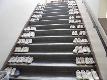 階段に並んでいる白い下くつは3年生のものです。幸か不幸か南中の体育館には下駄箱が不足しており、沢山の人が体育館を利用する場合は、下くつを下駄箱以外の場所におくしかありません。写真は3年生が工夫してくつを置いている状況です。ちなみに、この並べ方は教師は何も言っていません、すべて生徒たちで考えたものです。