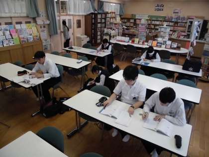 写真は順番をまっているあいだ、図書室で自習する3年生です。
