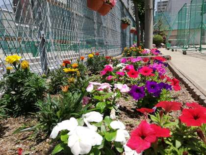 ペチュニア、ニチニチソウ、ガザニア、マリーゴルドそして、ネットにベゴニア-センパ不ローレンスが植えられています。