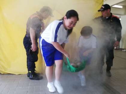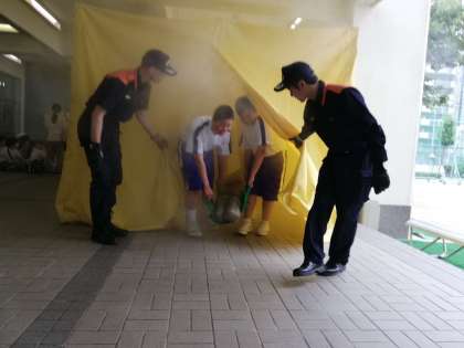1年生は、煙体験、消火器を持って看板に描かれた火を消し、60kg の人形を担架に乗せてまた煙の中を戻って来ます。