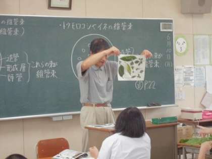 「この葉っぱは、今朝、先生が採取してきたものです。何という植物の葉っぱか、みなさんで今から調べましょう」