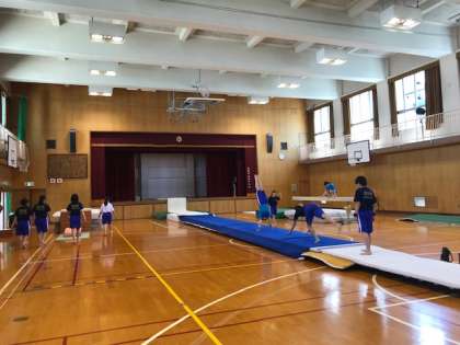 夏休みも半分過ぎましたが、猛暑の中、夏休み明けにあるブロック大会に向けて頑張っています。南中学校には競技用の鉄棒や平均台など器具が揃っています。練習の後は学習会も行っています。