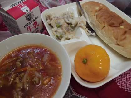 グラタンは独特の風味でしたね。おそらく豆乳の影響でしょうか。トマトスープは体にじんわりしみこむお味でした。それと今日はしっとりとして、一寸ふかふかのパン。