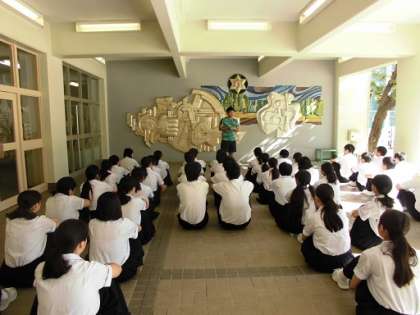 毎週金曜の朝は、ピロティにて3年生の学年集会がおこなわれます。今日も厳しい日差しのもと、てきぱきと集合できましたね。