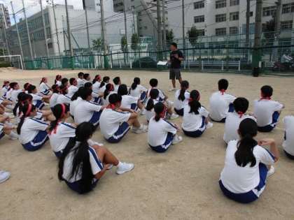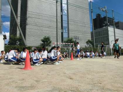第2グラウンドです。日差しがきつくて、みんなまぶしそう。でも頑張って行進してますよ。先生のお話を聞く姿勢もピシッとしてますね。