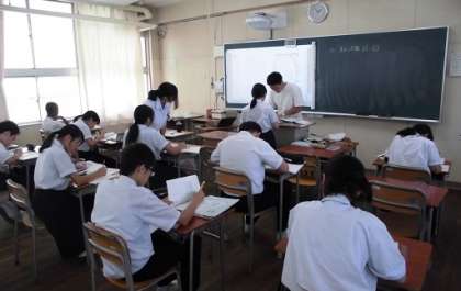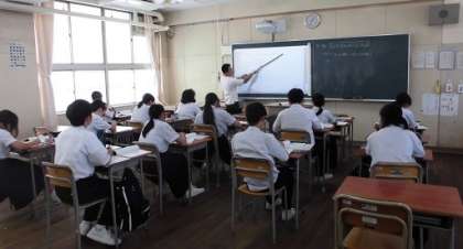 1次関数について学んでいます。先生が定規を使用してy切片について説明しています。そのあとで、みんな演習問題を解いていますね。